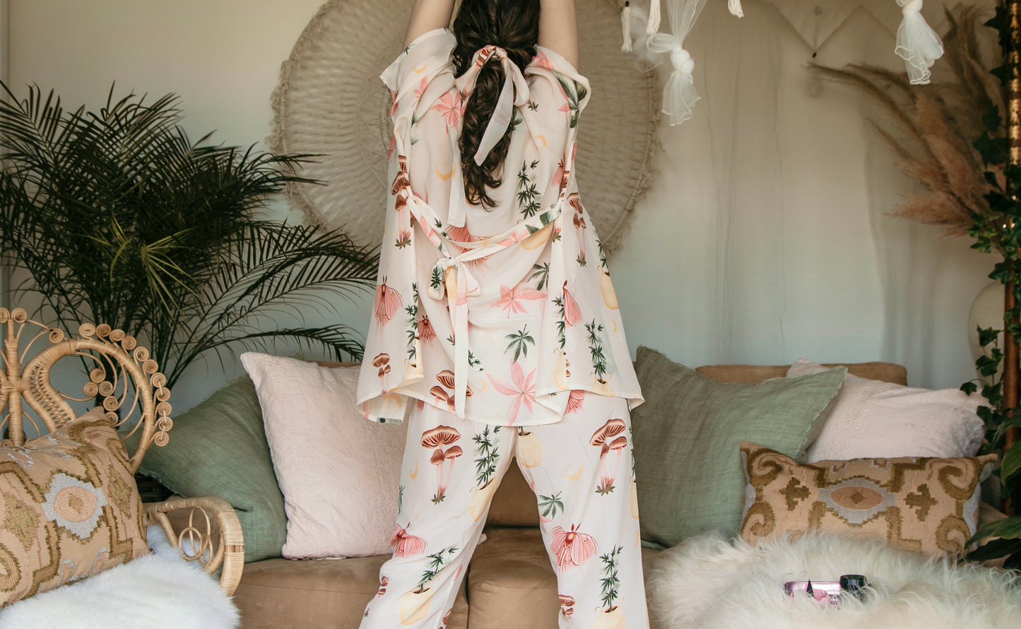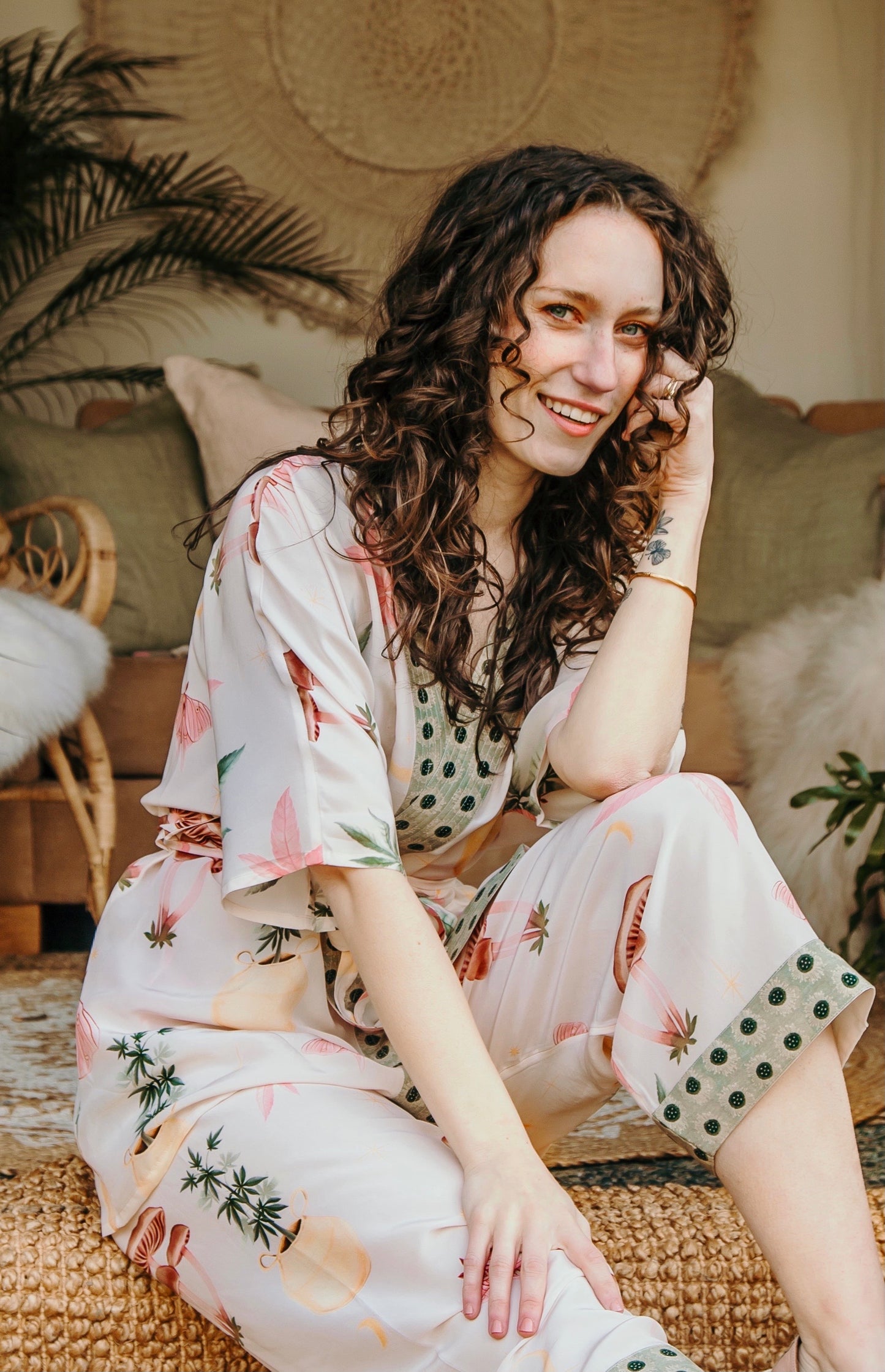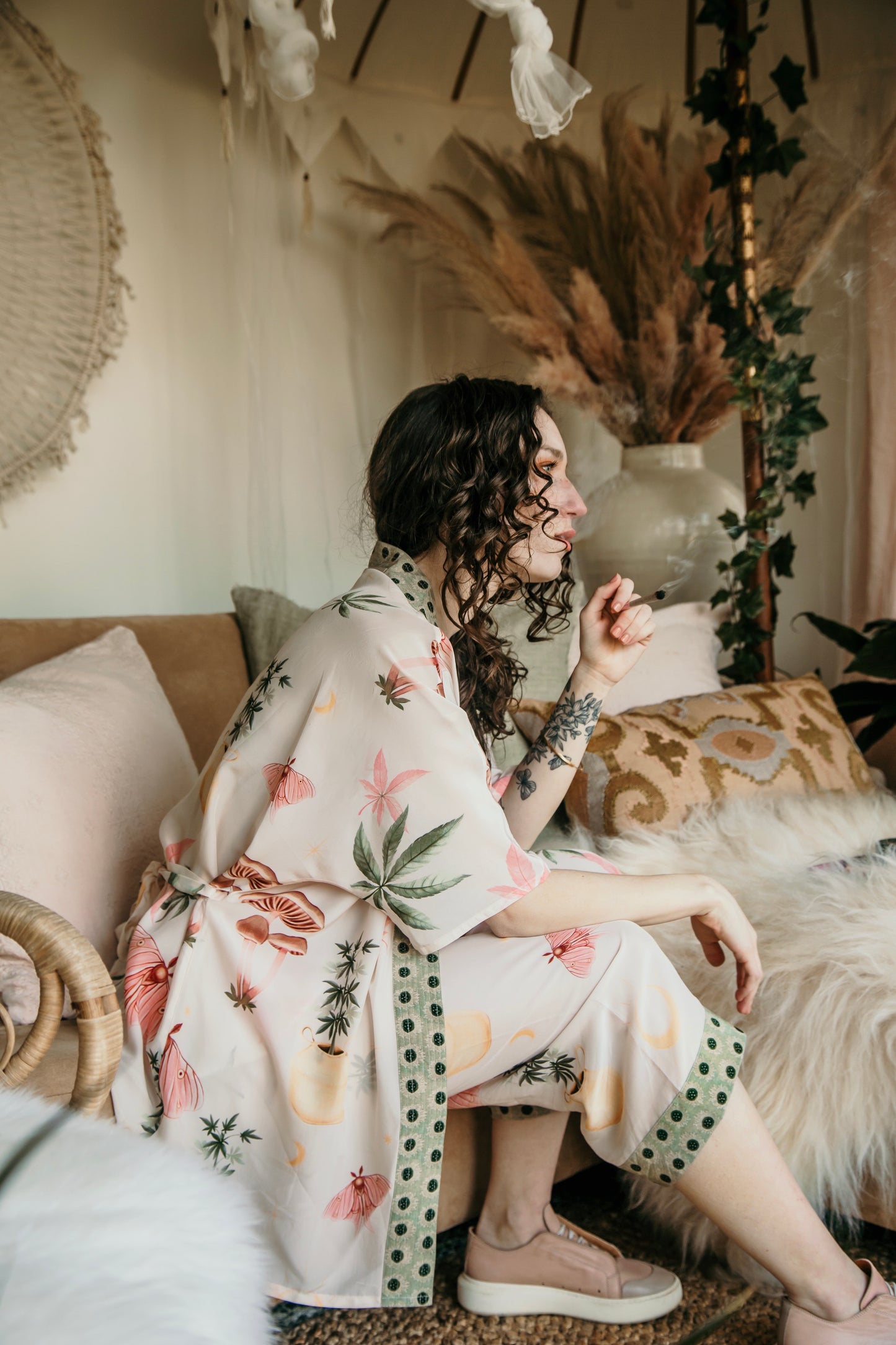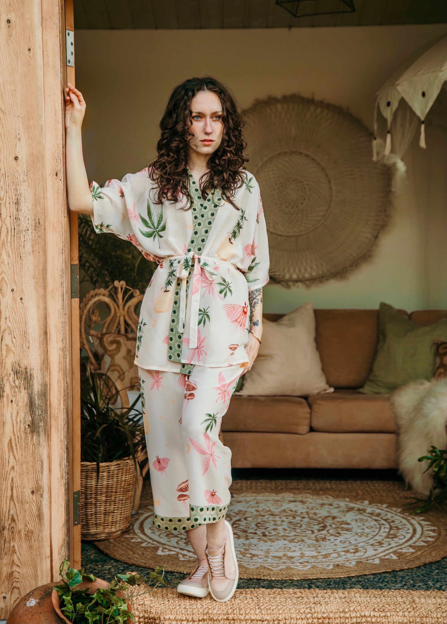 We dreamed up this ethereal, slightly cheeky print as a celebration of the delicious luxury of lounging. Featuring original moon moth, cannabis, and mushroom artwork hand-painted for us by the talented Kat Cearns, this design drifts through a palette of soft pinks, dusty sages, and hazy garden greens. The moon moth—long a symbol of intuition, awakening, and luminous transformation—appears here in Kat’s charming rosy rendition, fluttering through a world of whimsy and gentle rebellion. A duster for wanderers, daydreamers, and those who believe in a little light mischief ;)