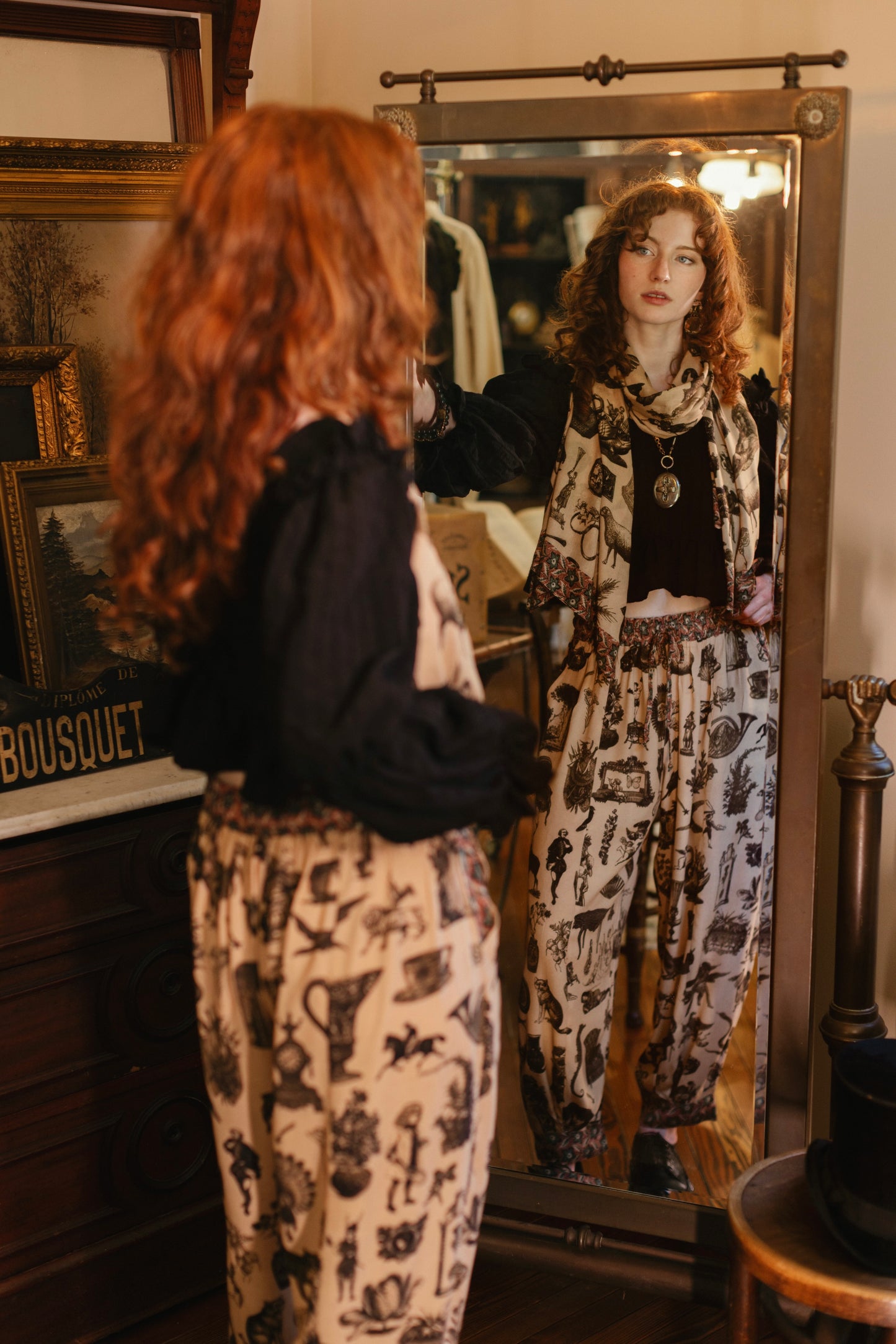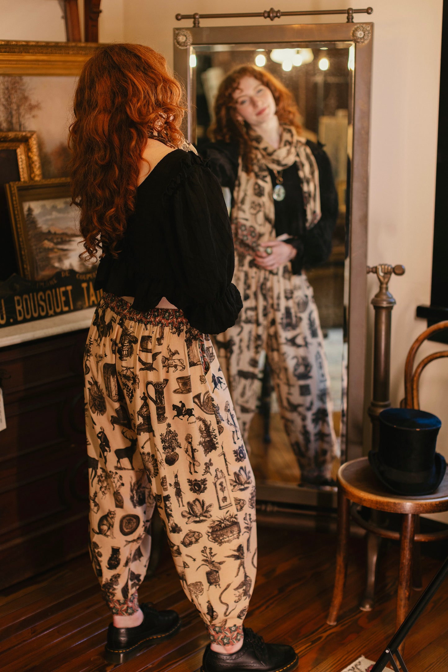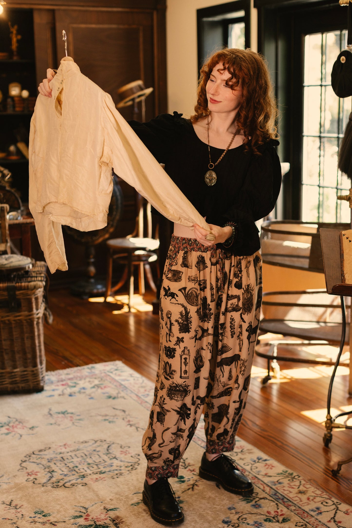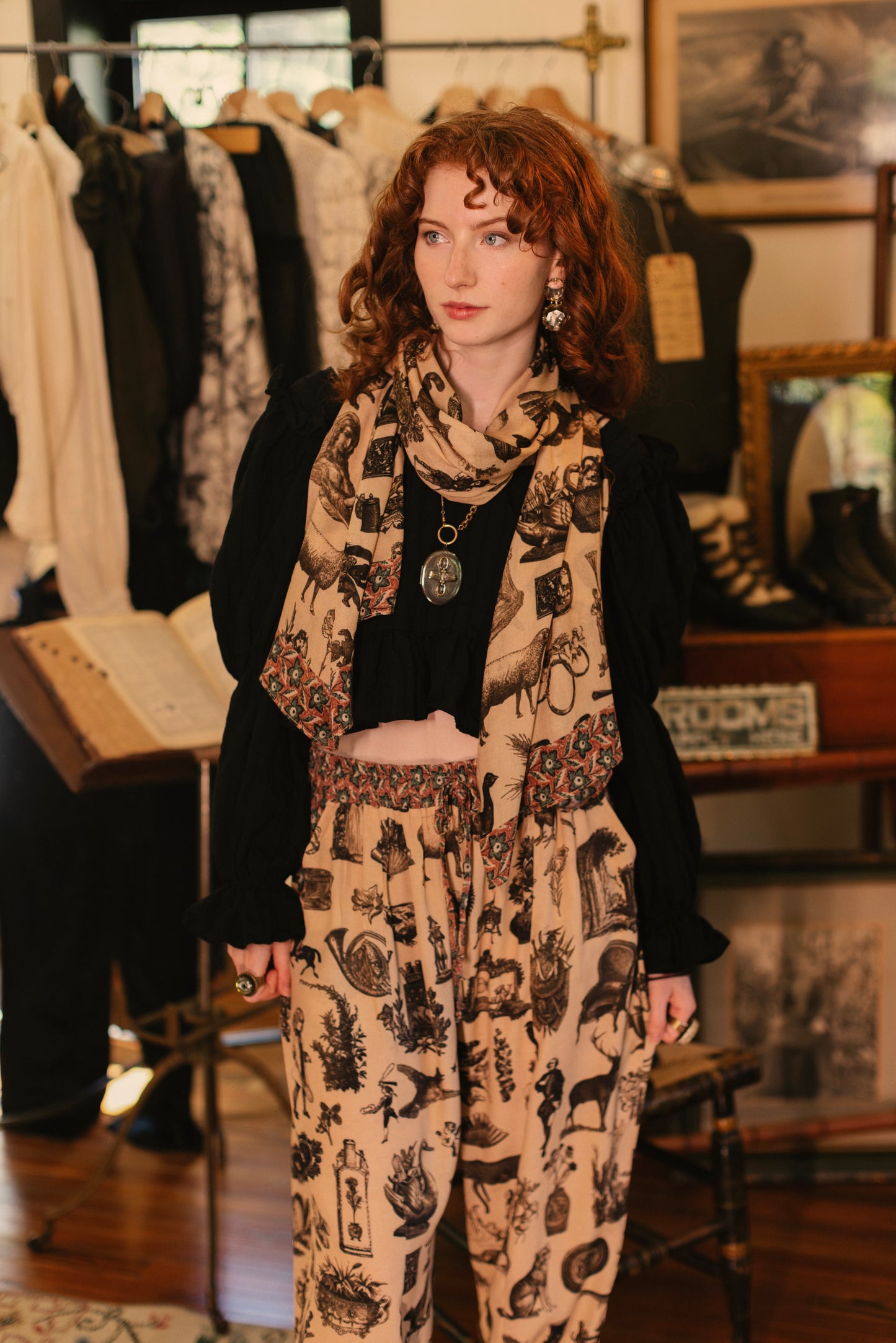 Some designs at Market of Stars begin as secrets (with no real plans to release them), created simply because we want to wear them ourselves! Curiosities was one of those prints—until we shared it online and were met with an outpouring of love. Our Stargazer community wanted it too, so here it is: a print born from the pages of a mysterious Victorian scrapbook kept by an unknown woman in Paris around 1870. Within its worn pages, she carefully clipped and collaged hundreds of fragments of her world—delicate bouquets, elegant vases, shooting stars, birds in flight, and a delightfully startled cat who seemed to demand a place in our design :)