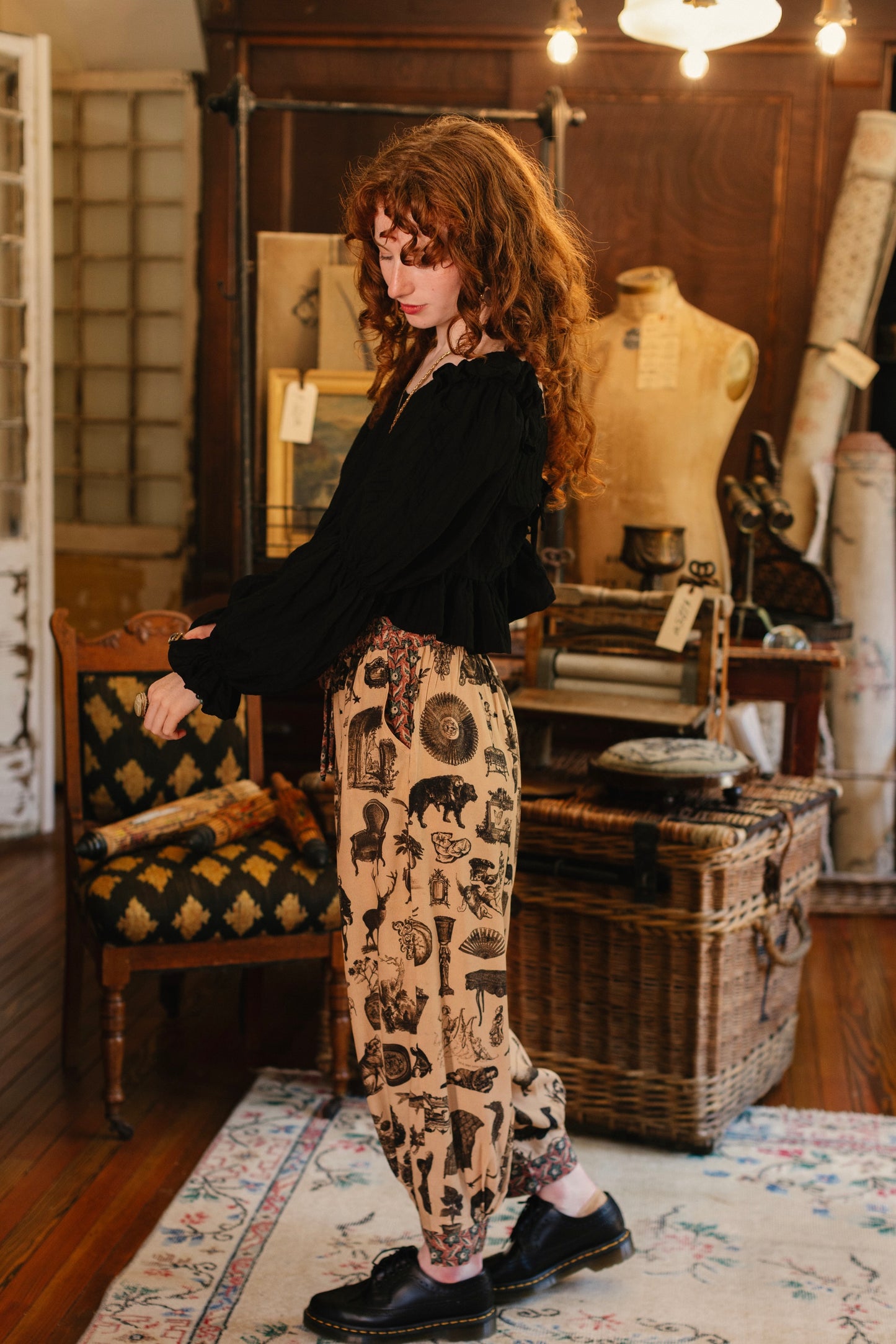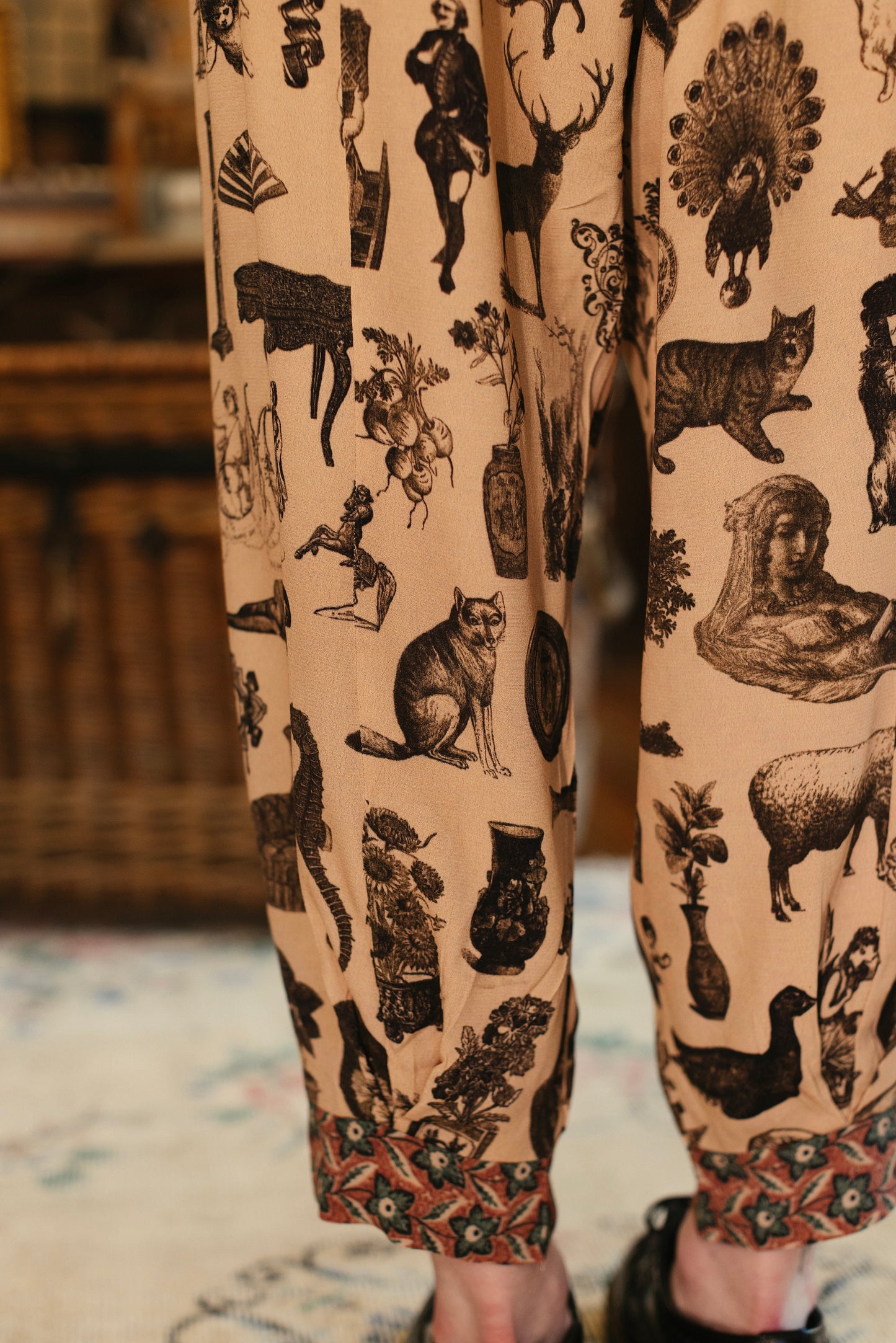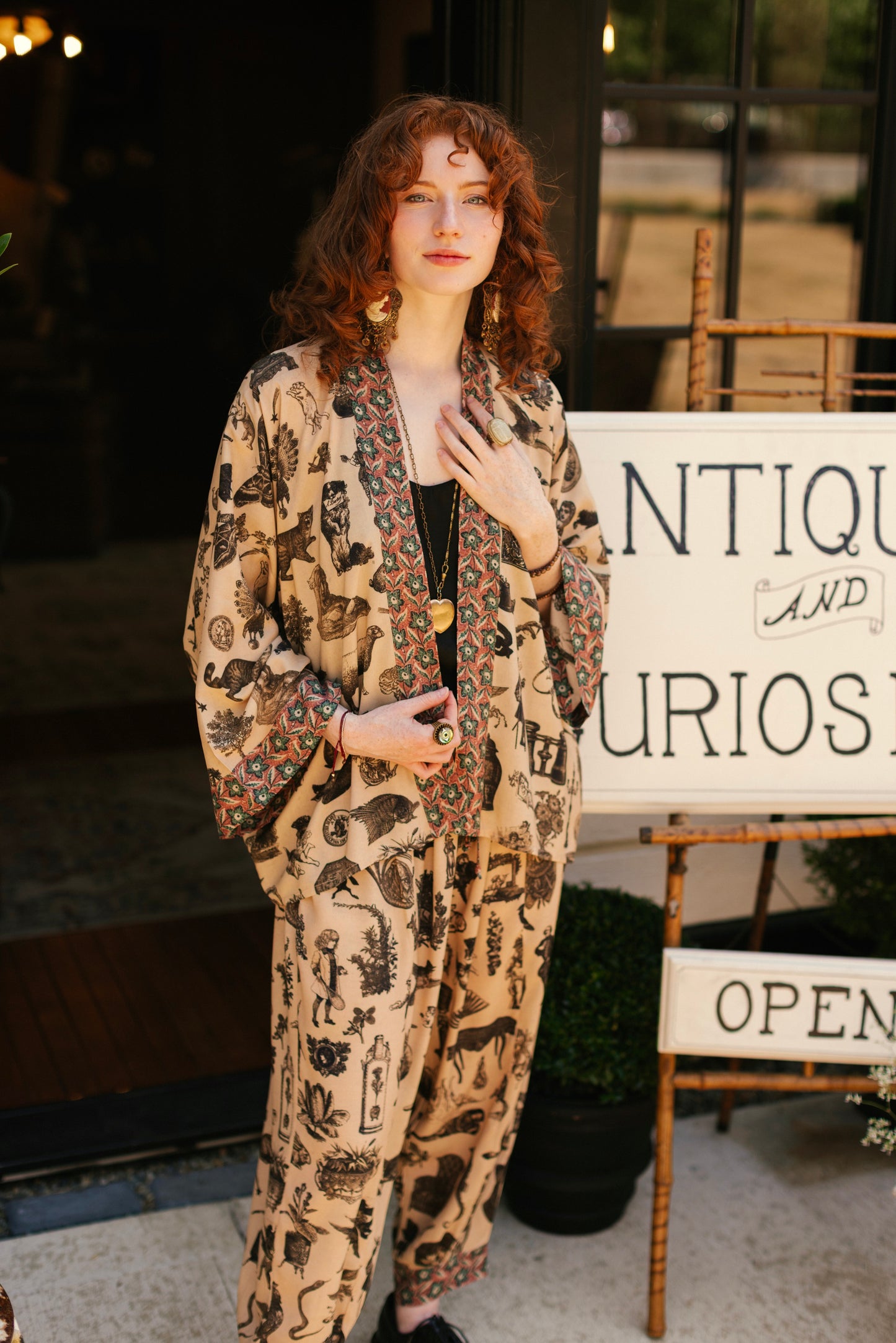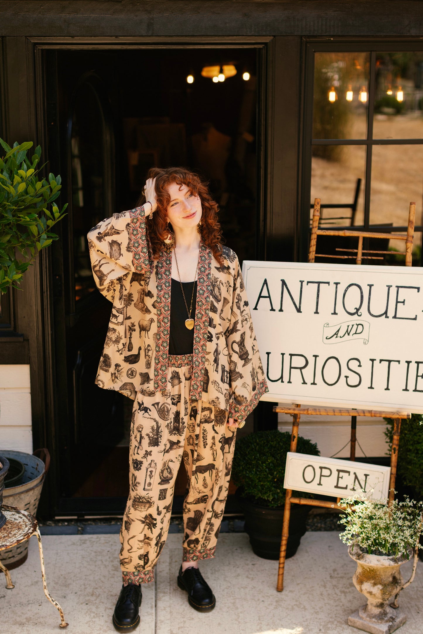 Some designs at Market of Stars begin as secrets (with no real plans to release them), created simply because we want to wear them ourselves! Curiosities was one of those prints—until we shared it online and were met with an outpouring of love. Our Stargazer community wanted it too, so here it is: a print born from the pages of a mysterious Victorian scrapbook kept by an unknown woman in Paris around 1870. Within its worn pages, she carefully clipped and collaged hundreds of fragments of her world—delicate bouquets, elegant vases, shooting stars, birds in flight, and a delightfully startled cat who seemed to demand a place in our design :)