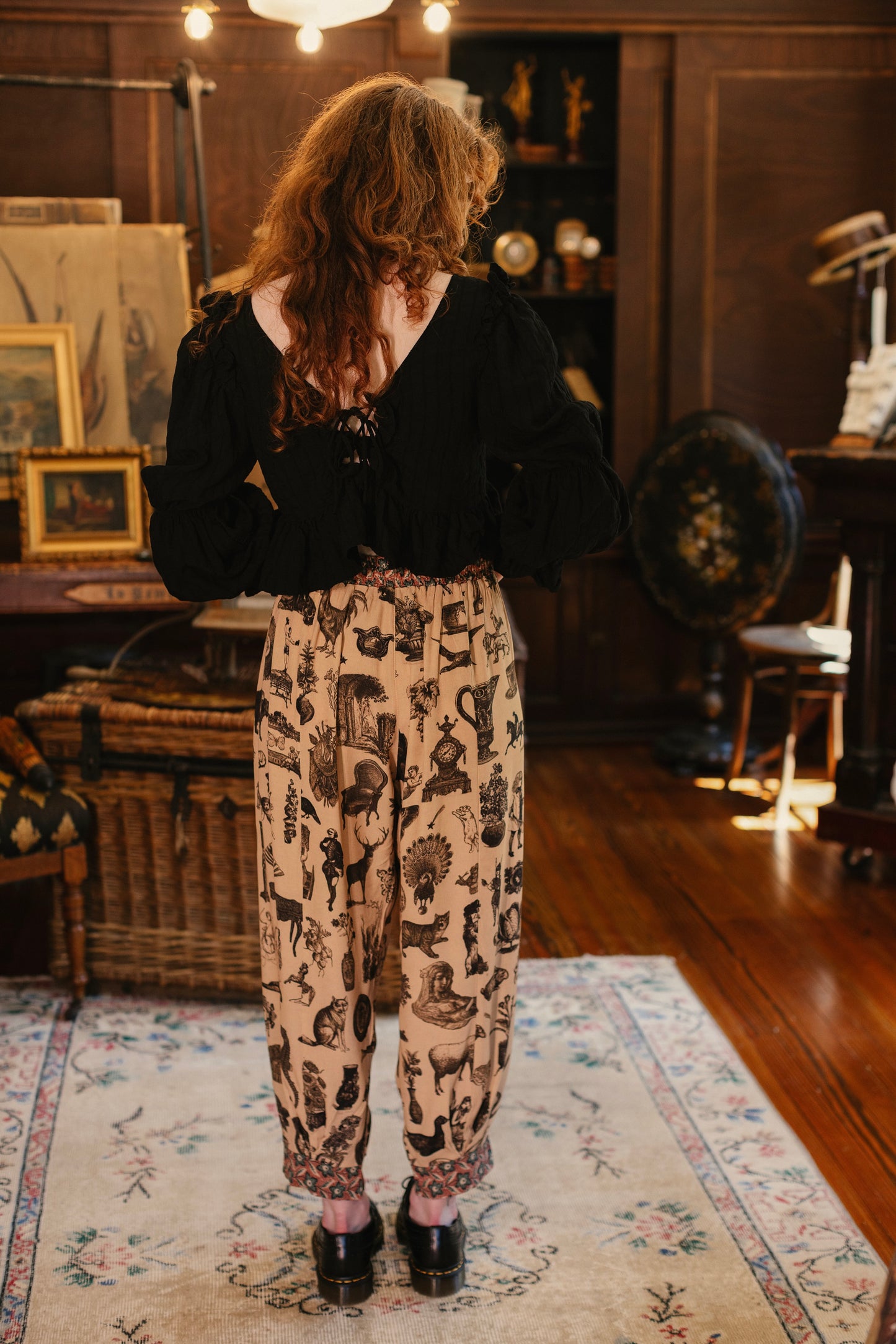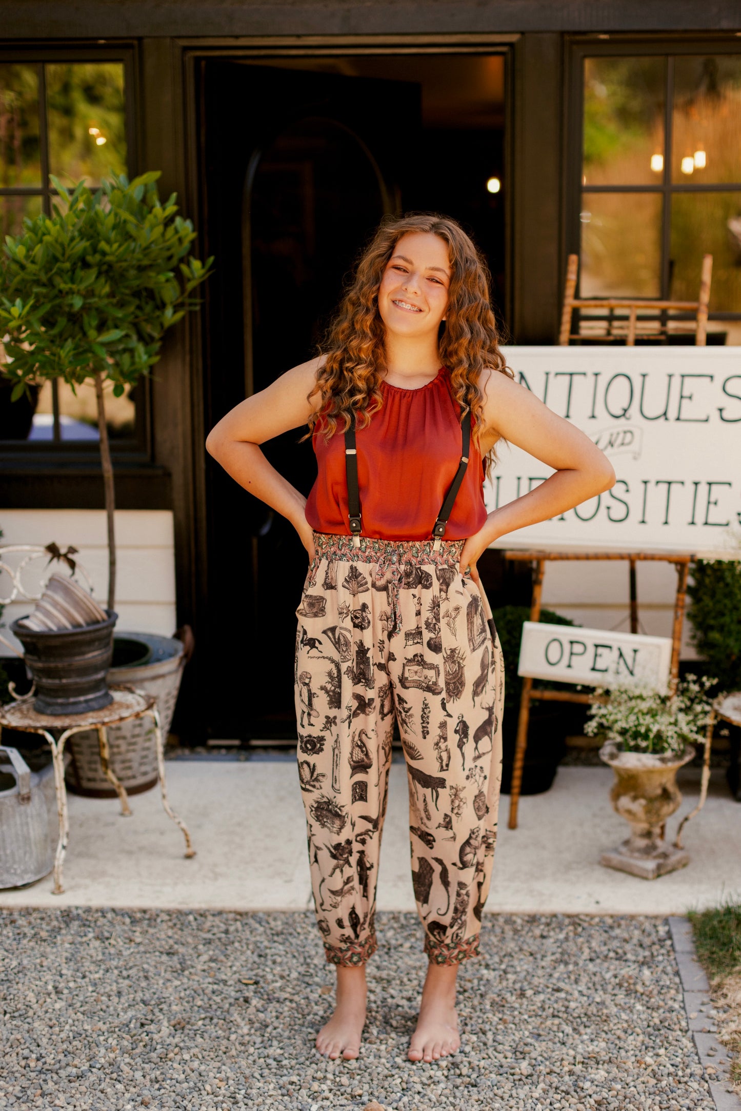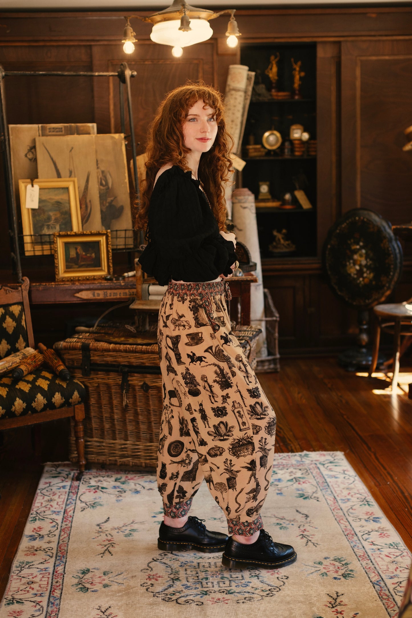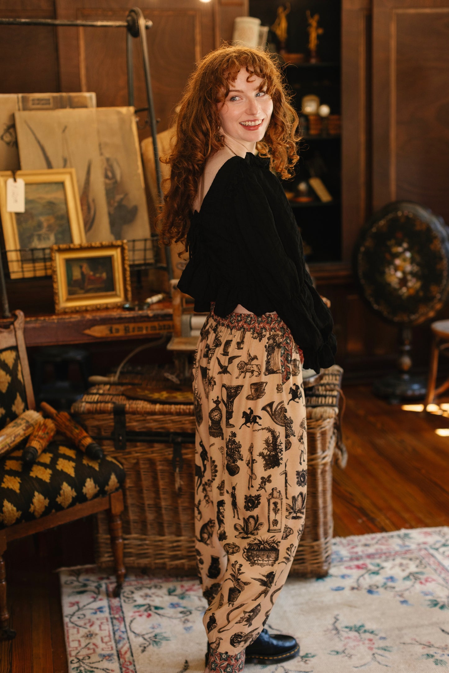 Our dreamy new Poet Pants are made from a lightweight, drapey viscose crepe that moves like poetry in motion! With a flowier cut than our Artist Pants, they feature an elastic waistband with drawstring, roomy pockets, and a breezy 3/4 length. The gently tapered cuffs create a billowed silhouette reminiscent of vintage artist smocks— relaxed, romantic, and ready for adventure. Wear them with sandals and a tank for wandering cobblestone streets, or dress them up with oxfords and a structured blouse for an effortlessly bohemian vibe. Warning: may inspire spontaneous sonnet-writing ;)