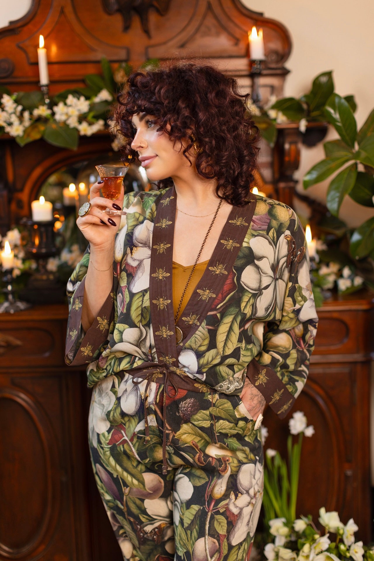 Fleur de Lune is our luminous tribute to creative dreams; the quiet magic of moonlit gardens where imagination unfurls in the hush of night. Weaving together artistry of centuries past, this opulent collection features magnolia lithographs found in 18th and 19th century natural history books from Carolina and Virginia, and hand-coloured engravings of pears and figs plucked from historic botanical prints. The delicate moths that flutter across the design — including the ethereal luna moth — come from an 1894 etching, while the little golden bumblebees on the trim are borrowed from an embossed Victorian book cover.