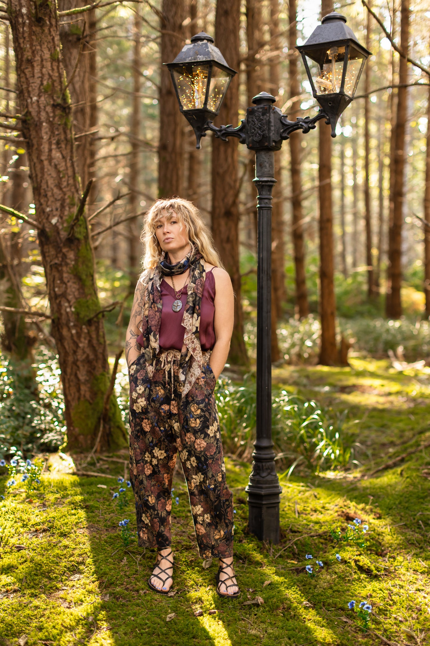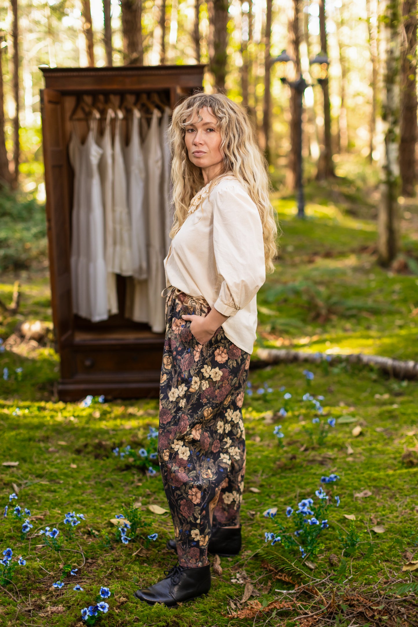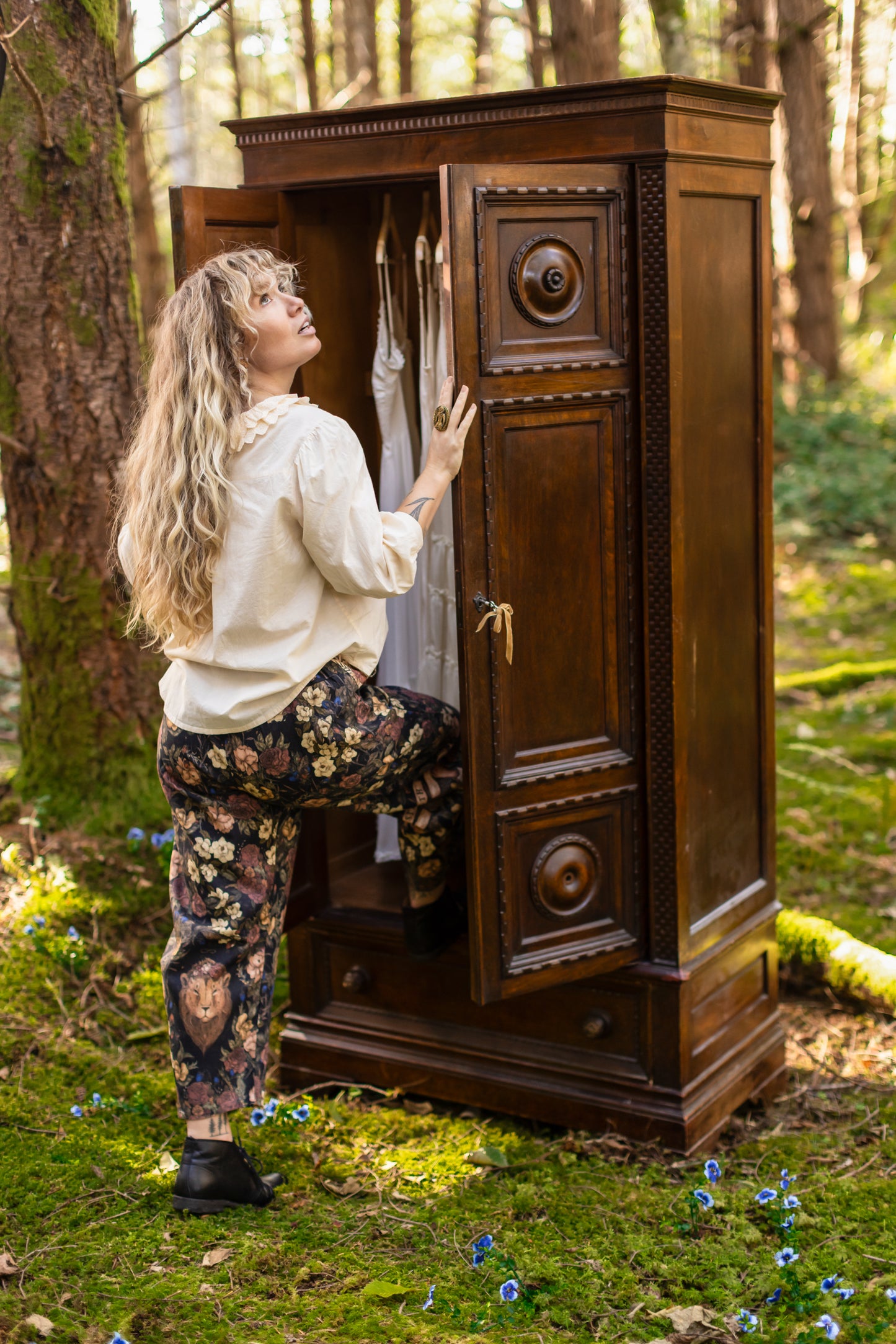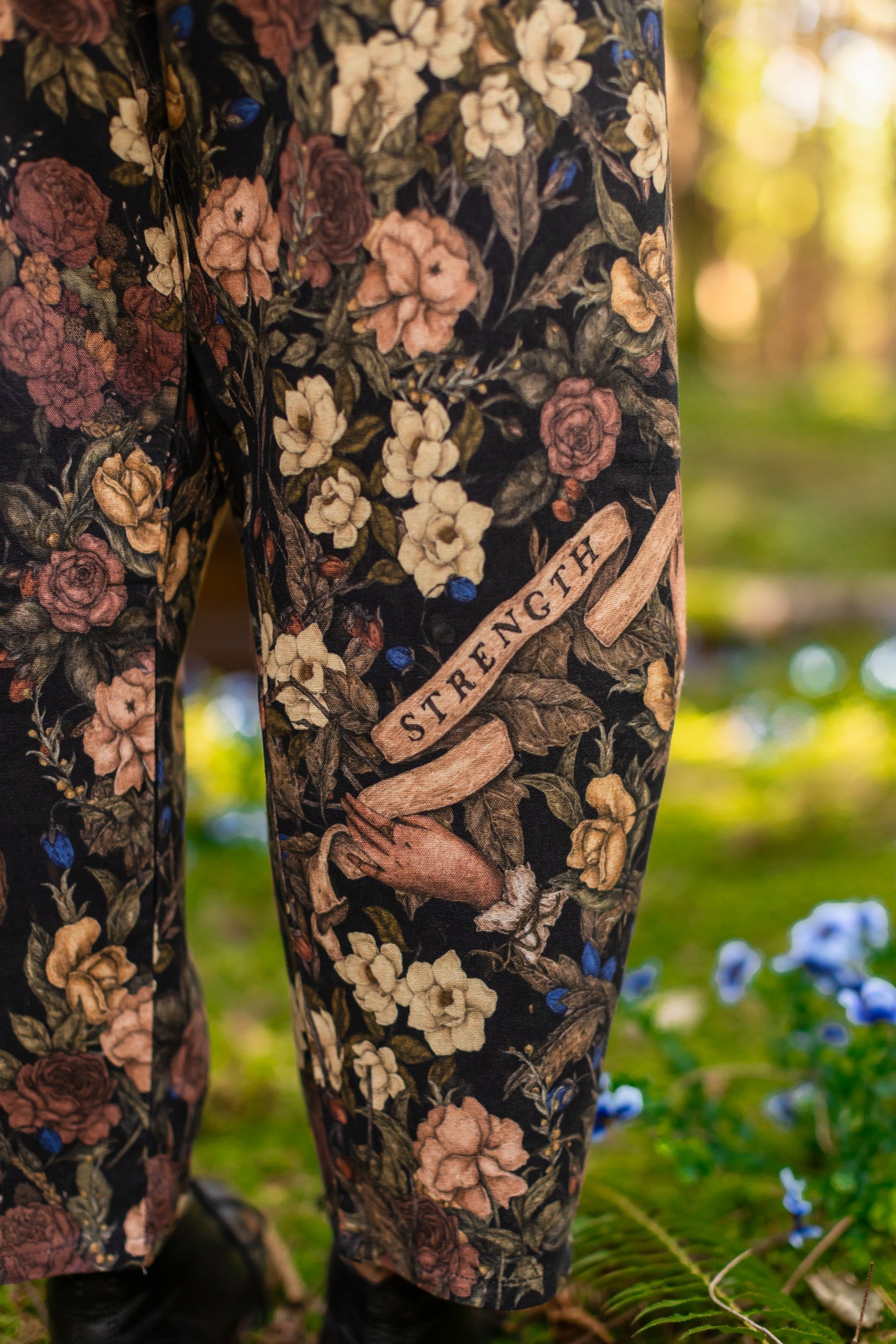 Sometimes we stand quiet and steadfast — and sometimes we roar. Lionheart is a celebration of strength in all its forms: the fierce and the brave, the soft and the graceful. Created in collaboration with renowned artist and illustrator Jessica Roux — whose work is filled with intricate botanicals, timeless creatures, and a sense of quiet wonder — this design captures the heart of courage itself. Featured on the left leg is Jessica’s majestic lion crowned with roses, his gaze both powerful and impossibly tender—our nod to Aslan from the pages of Narnia. Around him, roses bloom as symbols of love and friendship, while magnolias weave through the tangle, representing gentleness and resilience. Each flower is meticulously collaged from Jessica’s paintings, creating a beautiful tapestry of her signature style. An infinity symbol arcs above, a sign of boundless strength and eternal love. Featured on the right leg, two delicate hands unfurl an antique banner reading Strength, offering the reminder that true bravery is not only loud and fierce, but also soft, steady, and enduring. We invite you to step through the wardrobe, and in to Jessica’s remarkable world.