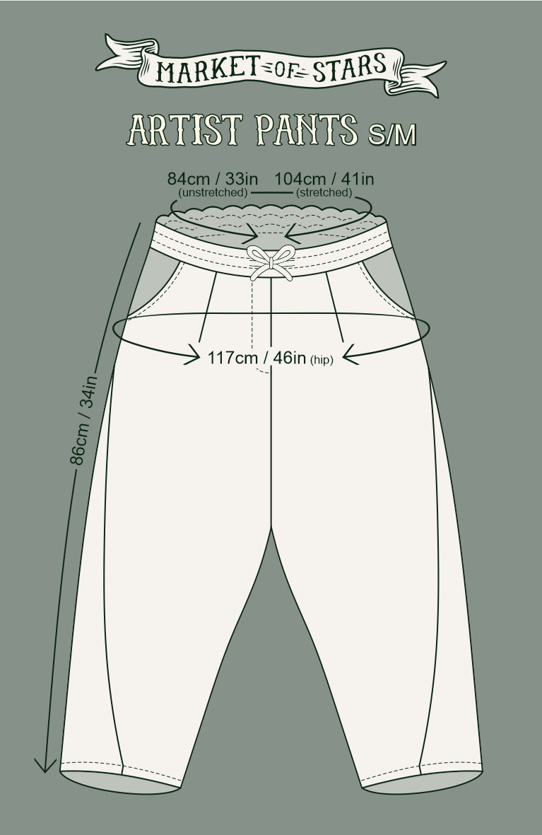 These Artist Pants come in 2 sizes, Original O/S & L/XL. See Pant Diagram in photos for measurements. Model is 5'3" for reference.