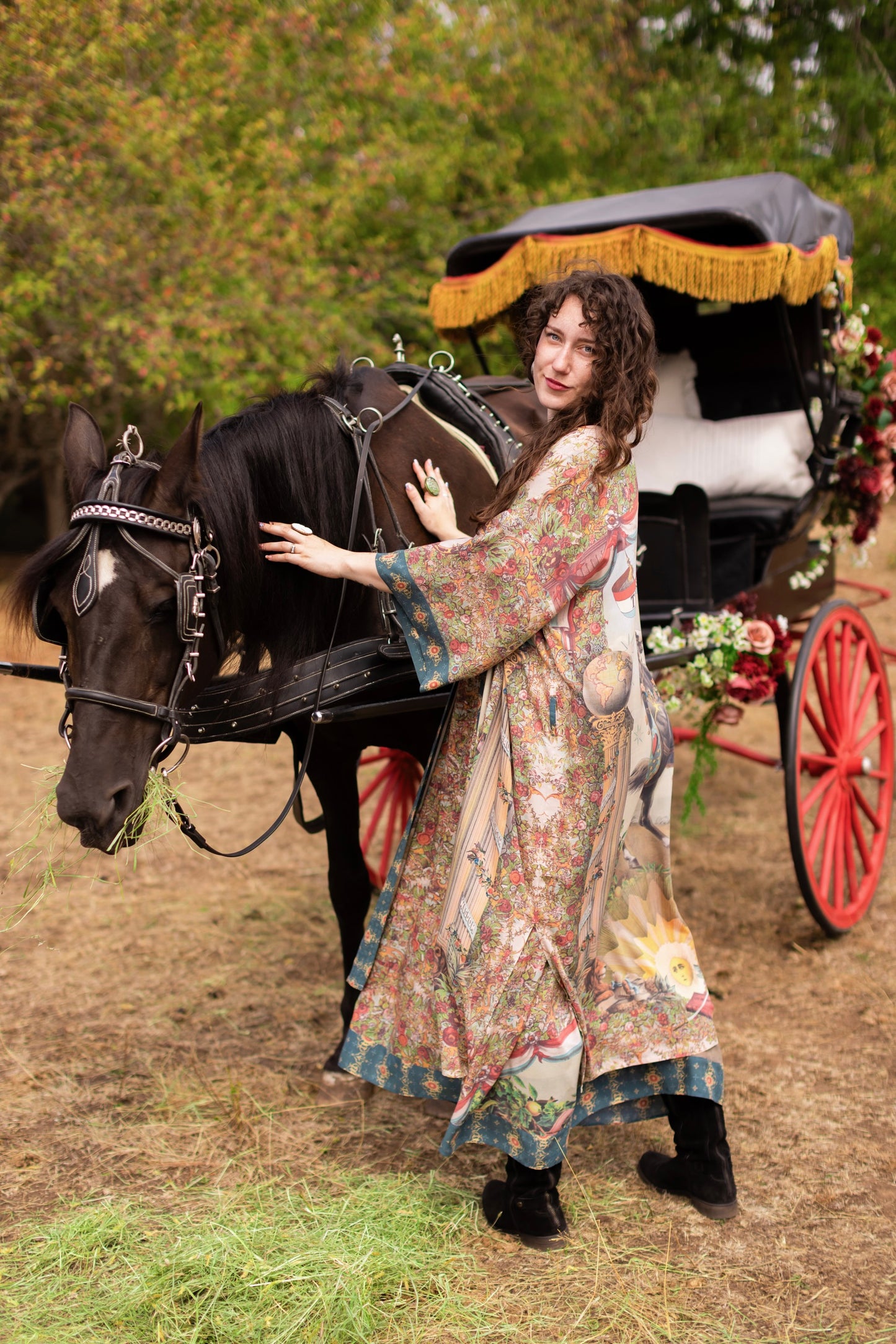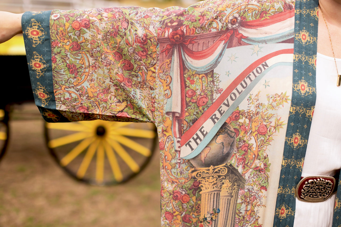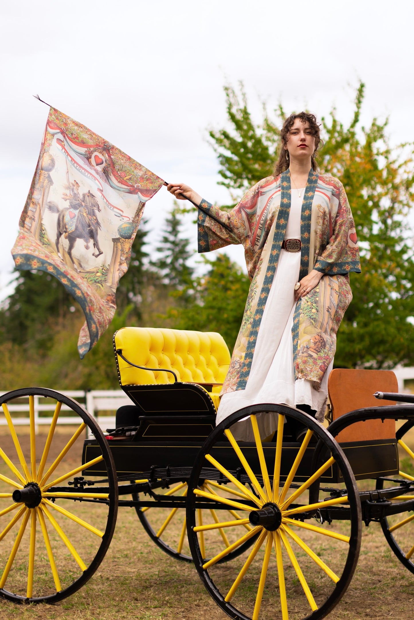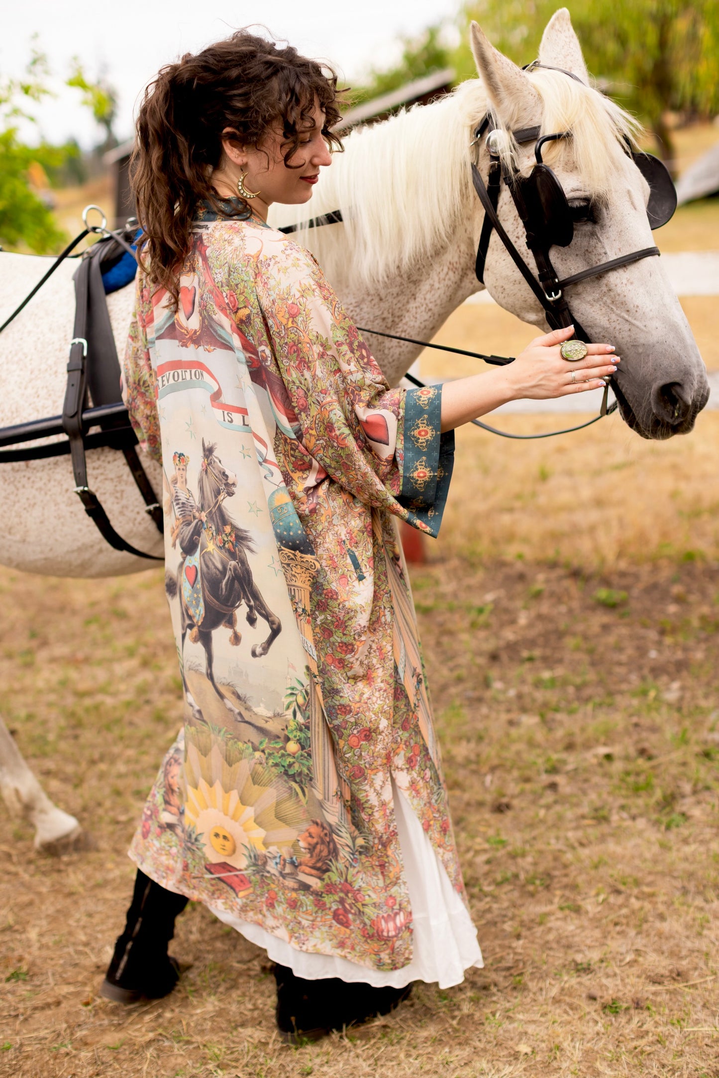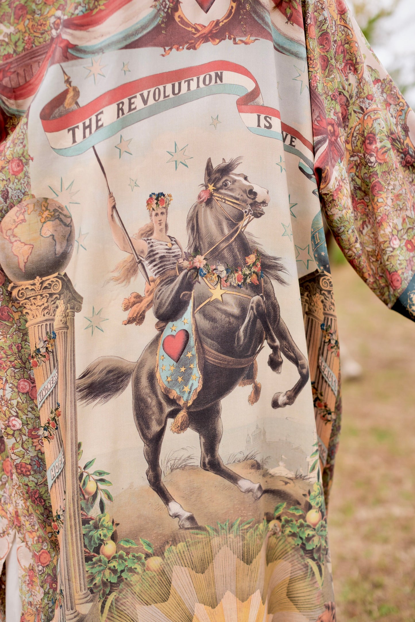 Love Revolution dares to say what history so often forgets — that love itself can be the boldest force of all! At its heart is an extraordinary 1892 French hand-coloured poster of a woman astride a rearing horse, her banner flying defiantly in the wind and emblazoned with the words The Revolution is Love. Around her, the design blooms with flowers and rosettes borrowed from artwork of the same era, while French lions rest at her feet, embodying courage and strength. The columns with beribboned banners bearing messages of hope, faith, and beauty are taken from an 1870’s lithograph, as is the little sword and antique book etched with the timeless words: love one another. Rendered in vintage hues of faded red, sunwashed blue, soft green, and aged ivory, Love Revolution carries the romance of something both timeless and quietly radical. Every detail breathes with the idea that beauty, hope, and love are not fragile things—they are forces, capable of transforming the world one fearless heart at a time. Long live the revolution :)