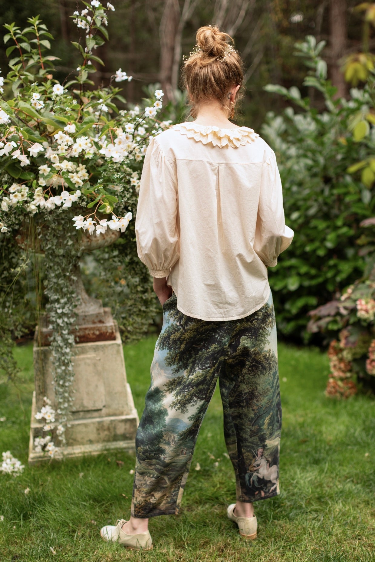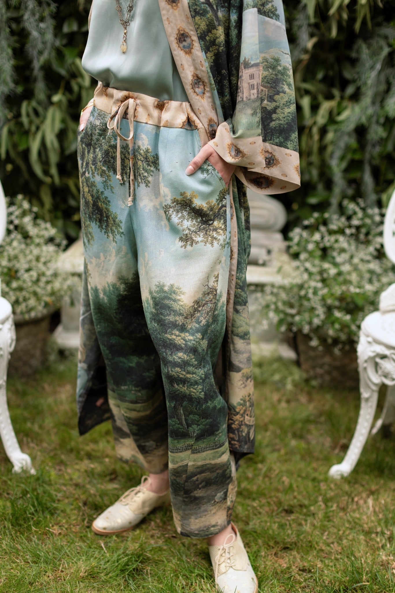 Rendered in faded tones of moss green, soft blue, and weathered gold, the palette feels timeworn, as though the piece itself has been passed down through centuries of telling and retelling. Like the women of Arthurian lore — those who shaped destiny with wisdom, will, and wonder — The Mythmaker honours the bold act of choosing possibility. It is a garment of story, a whisper of legend, and a reminder that sometimes, the most powerful path is the one we dare to imagine.