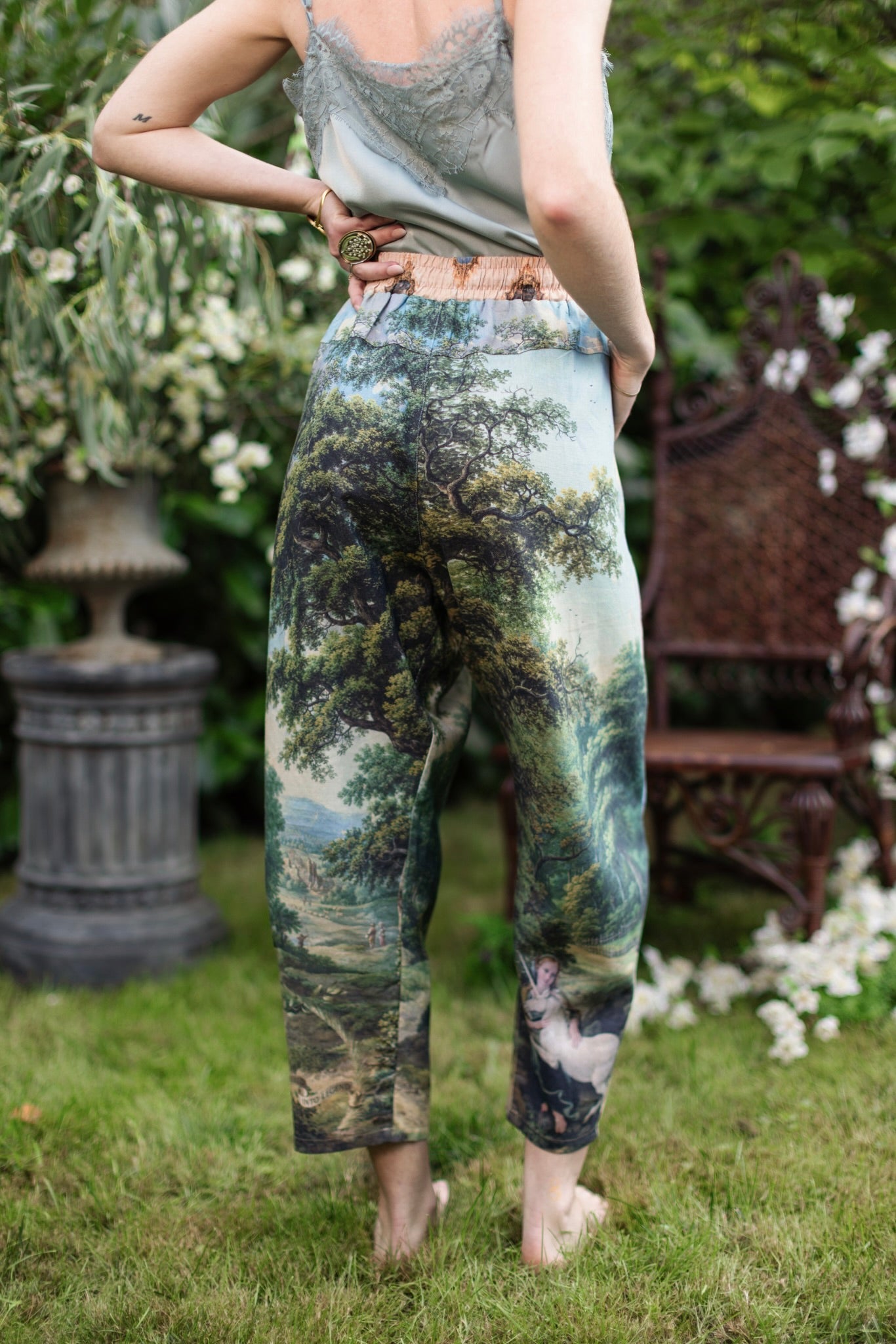 The left leg features a fresco from the early 1600s, where a barefoot woman cradles a unicorn — a creature long associated with intuition, purity of heart, and the magic that lives just beyond the veil. As a final, poetic touch, we added a laurel, palm, and juniper wreath — painted by Leonardo da Vinci — inscribed with the words: She wandered into legend.
