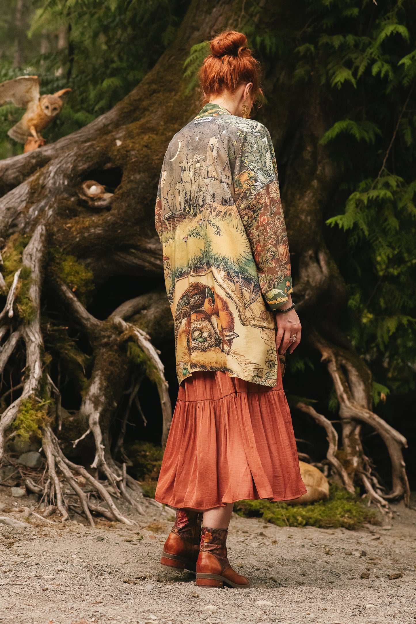 At the heart of this delightful print lies a cozy underground burrow where a fox curls protectively around a pheasant and her nest of eggs, their peace unbroken by the roles the world expects them to play. Above, the moonlit forest stretches out—a gnarled old tree rises from the earth, a castle glows faintly in the distance, and a wise owl sweeps across the night sky. In his talons, he carries an hourglass and a message, as if flying between worlds to deliver a truth we must not forget.
